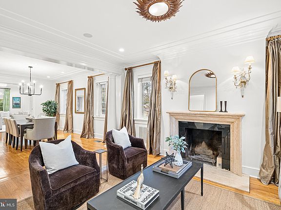 This rarely available Wardman end townhouse is desirably located in the distinguished Kalorama neighborhood, known primarily for being home to many diplomats, dignitaries, and other prominent Washingtonians. This impressive semi-detached residence was originally built in 1923 and has been beautifully updated. The house encompasses over 4,600 square feet of interior living space with generously-scaled formal entertaining rooms, as well a comfortable family living spaces. Stunning architectural details are found throughout including lovely archways, impressive columns, thick crown moldings, paneling, transom windows, and detailed fireplace mantles. The home captures an abundance of natural sunlight from exposures on three sides, which is further magnified by the large windows and high ceilings throughout. A gracious entry hall with marble floors seamlessly transitions to the sophisticated living room with a fireplace. The living room adjoins the formal dining room, which is framed by attractive columns. The gourmet kitchen is well-appointed with abundant cabinetry storage, stainless steel appliances, marble countertops, and a large center island with a breakfast bar. The kitchen opens to a sunny breakfast room and to the generous family room, both of which have French doors to the large wrap around covered terrace. There is also the added convenience of a powder room on this floor. An elegant staircase leads to the second level, which offers a large landing, flooded with sunlight from an overhead skylight. This level, which acts as a primary floor, includes the luxurious primary bedroom with a private balcony and an en-suite bathroom with dual vanities, a frameless glass shower, and separate soaking tub. There is also a lovely private sitting room/office on this floor with built-in bookshelves and a fireplace, as well as a secondary full bathroom and large closet. The top floor of the residence offers two additional bedrooms, both spacious and light-filled, and a hall bathroom. One of the bedrooms has a large private balcony with remarkable panoramic views of Washington. The fully finished lower level offers various rooms with great flexibility. There is an office with built-ins, a sitting room, secondary kitchen, bedroom, full bathroom, and a sauna. There is also a laundry area, ample storage space, two-garages, and walk-out access to a terrace/additional parking space. The exceptionally private wrap-around rear terrace is wonderful for entertaining with multiple seating areas, a charming pergola, and beautiful mature green surroundings. This spectacular residence is within close proximity to neighborhood parks, restaurants, and shops.