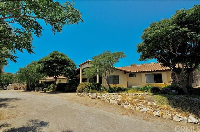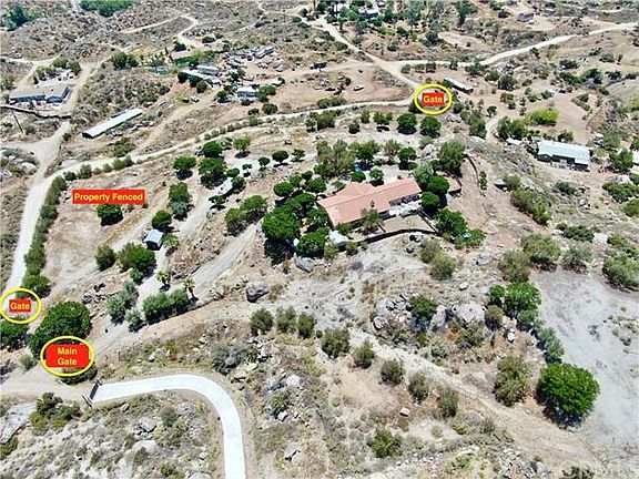 Airy and open 2462 sq.ft. ranch style home on sprawling acreage is a one-of-a-kind sanctuary tucked away in the rolling hills of Homeland. Just a mile outside of the gates of The Ranch at Sky Mesa, you will find this large, bright, single level, multi-generational home that boasts sweeping views of the valley below to the mountains in the distance, including Diamond Valley Lake. Step inside the grand entryway to a large, open concept living space with vaulted ceilings and plenty of light and room for entertaining. Beautiful brick fireplace with passthrough wet bar and seating. To the right of the entry, four spacious bedrooms, one with large front yard facing bay window, each with walk in closet. One separate shared bathroom with large shower. Enter your expansive master suite through large double doors with extra-large ensuite, dual vanity, walk in closet, bathtub/shower and a separate toilet room and additional standing shower. Down the hall, past your living space sits a sunlit breakfast nook with beautiful antique wood burning stove. The kitchen features wrap around counters with a deep three compartment sink and dual ovens. No kitchen is complete without a walk-in, floor to ceiling pantry. Serve guests with ease in the formal dining room directly off the kitchen. You will get plenty of light pouring in from the large picture window. On your way out to the garage, you will find a sizeable laundry space with attached half bathroom. Spacious two car garage has plenty of room for storage. Notice the door in the garage to the backyard, it was hand carved in Slovenia. Marvel in the ample backyard space with something for everyone. Oversized covered brick grill, potting shed complete with water and power, space for horses, cows, chickens, goats, pigs, dogs, and more. Separately gated portion of yard includes coops, pens, and a storage/workmans shed with power. Head down the winding driveway to the pad below that features additional storage shed with water and power, a lean to, and space for trailers, animals, toys, and more. Lots of space for additional dwelling unit. With 170 trees for sanctuary like privacy, and acreage that is completely gated, you will never want to leave. Everything you need is right here with no association dues or mello roos. Need more room? The 7.39 separate legal parcel above with pads to build, space for agriculture and or animals, is also offered by owner. See listing MLS#LG21109791 for details.