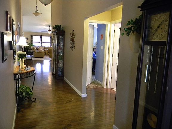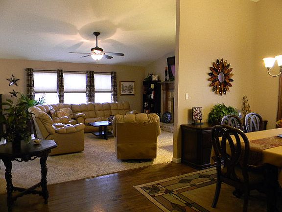 Don't let this house fool you from the outside, the main level has 2,260+/- square feet with the finished walkout basement included there is over 3,400+/- square feet. 3 car garage with openers and insulated, 5 true bedrooms, 3 full baths, separate dining room, brick gas fireplace, patio, deck, with a covered awning and stairs, covered front porch, split bedroom plan, open floor plan. The kitchen has 42" custom cabinets, ceramic back splash, double ovens, newer electric cook top, breakfast bar, walk in pantry, large main floor laundry with washer and dryer staying, alarm system. You will also enjoy the large community pool and stocked community fishing lake.