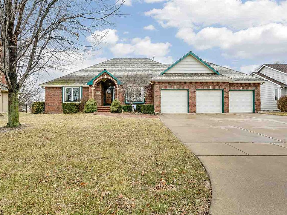 This very well maintained all brick ranch home is located on # 6 Green and #7 Tee box at Reflection Ridge Golf Course. This home is very open and with 9' Ceilings and great view of the Golf Course. The main level Formal Dining Room, Living Room, Kitchen, Hearth and Kitchen eating area all have Hardwood flooring and the flooring was just all refinished and stained. The Large Kitchen features and island with Granite countertops as well as all other countertops. There is also an eating bar, nice bayed window and additional eating area, a Hearth area and a brick face fireplace and pantry. The Living room is also very large and has the back side of the Kitchen Fireplace. There is also Formal Dining, a large Laundry Room with sink and a door to a 12 x 12 covered Patio. There is a large Master Suite with a 9'6" x 10 sitting area, a large Master Bathroom with 2 sinks, a vanity area, whirlpool tub, shower and a walk-in closet. The main floor also has all the large base and casing through out. There are 3 more large bedrooms, 1 up and 2 down and all 3 have walk-in closets. The walk-out basement is all finished with a large Family Room and Fireplace and a large Rec. Room with a Wet Bar and a Pool Table that will stay with the home. There is also a Large Office 11 x 18 and a full bathroom with 2 sinks. The garage is a 3 car garage all finished and painted, there is a 12 x 18 covered wood deck, a well and sprinkler system and there are NO SPECIALS. All the windows are CLAD Windows and not wood. Home is in the MAIZE SCHOOLS and located just minutes from New Market Square, Doctors, Dining and easy access to Airport and Highways.