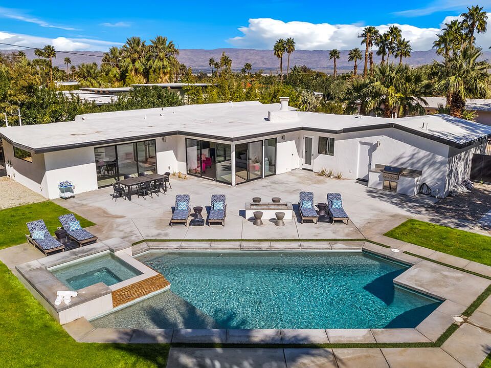 Nestled within a sprawling, gated oasis awaits a meticulously renovated mid-century sanctuary. This three-bedroom, three-bathroom residence has been entirely renovated to the studs with permits including: underground plumbing, electrical, HVAC, windows, roof, etc. Every interior and exterior element has been touched in some way. Situated on a nearly 16,000 sq ft west facing, terraced, mountain view lot this home has anything and everything one could want in a Palm Springs getaway. Expanses of windows frame panoramic views of the lush lawn, sparkling renovated pool, mountain vistas, and dramatically designed landscape architecture. The entire home is bathed in soft natural light with the gourmet kitchen, living area, and primary suite each opening onto the expansive back yard. A large patio, built in BBQ, outdoor dining, and elevated gazebo capturing eastern valley views make the back yard a place where hours and stress melt away. This list of features has allowed to home to operate as a successful Airbnb, and it is being sold turnkey furnished per inventory to allow the new owner to begin enjoying the home immediately.