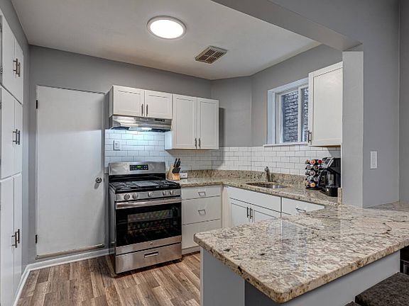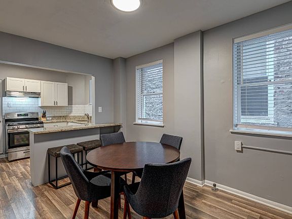This apartment has a private entrance at street level. The living room includes a small desk for those looking to work remotely, with the kitchen with granite countertops and a peninsula bar with two stools, while the dining area is adjacent to the kitchen.