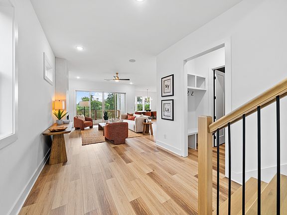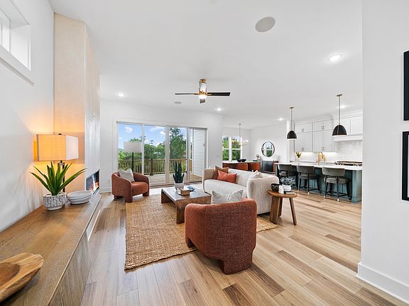 The finished basement includes a bonus room, guest bedroom, full bath, and access to a covered patio. On the main level, the open layout features a light-filled living room with an electric fireplace and a chef’s kitchen with quartz countertops, stainless appliances, statement island, and walk-in pantry. A mudroom, powder bath, and two-car garage complete this floor.