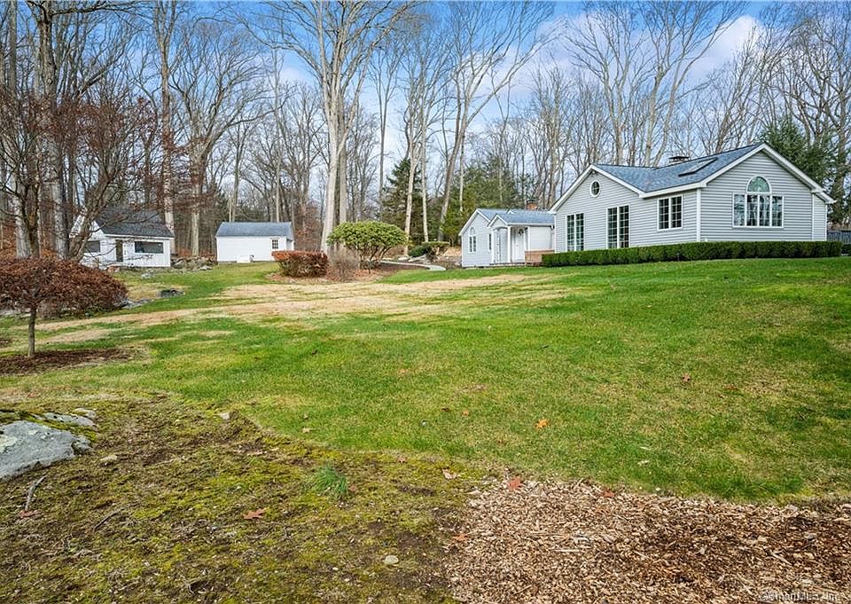A serene haven nestled next to conservation land, this renovated ranch-style estate offers charm and seclusion in a 5 bedroom, 2.5 bath house filled with casement windows and skylights that invite natural light and outdoor vistas throughout its expansive and open floor plan. For barefoot living enthusiasts, most shared spaces feature heated floors. A brand-new Carrier Infinity heat pump with high-efficiency propane furnace provides total climate control across seven independent zones for the ultimate in heating and cooling comfort. For peace of mind, a 24kw Generac automatic whole-house generator (supplied by a 500-gallon underground propane tank) was installed in 2023. Well water (and a whole-house filter) and ample on-site storage further adds to the practicality of this exceptional residence. A meandering bluestone pathway connects the private circular driveway and two-car detached garage to the main house. Upon crossing the threshold, a welcoming foyer unveils a pragmatic open floor plan. The eat-in kitchen (with induction range cooktop and countertop bar for four) features outdoor views and double French doors leading to the extensive back deck, setting the stage for easy entertaining and grilling. The living room, with wood-beamed vaulted ceiling, heated wood floors, and giant stone fireplace, transitions seamlessly to a generously sized dining room with outdoor views through its wrap-around windows. Off the living room, a glass door leads to a versatile flex room with its own heating/cooling zone. Ideal for use as an office, gym, or family room, this space boasts heated wood floors, vaulted ceiling, skylights, and a French door that leads to the deck and yard. Continuing beyond this space, the spacious and private primary bedroom offers panoramic views of the yard, rock garden, and conservation land. With a sliding door that leads to a stone patio and yard, it has ample space for a sitting area, library, office, or workout equipment. Adjoining the bedroom are a bathroom with a glass shower and heated tile floor, and a walk-in closet. At the other end of the home, three additional bedrooms plus a guest room with deck walk-out all offer hardwood floors and their own heat/cool zone. The four rooms share a full bath with double sinks, glass shower, heated tile floor, and separate toilet area. Please remove shoes before entering home.