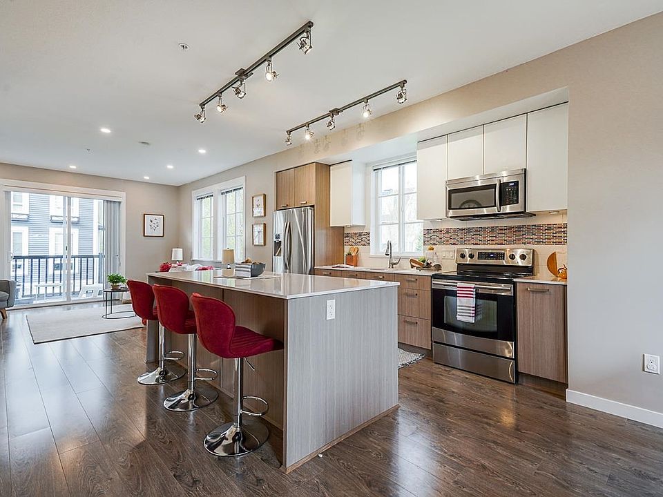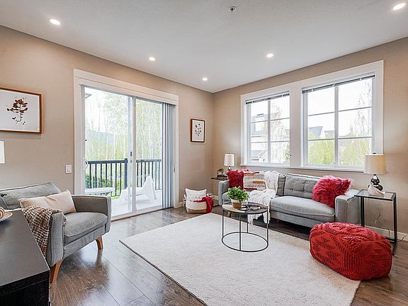 CORNER END UNIT 3BED 3BATH WITH 6 LARGE WINDOWS IN LIVING AREA is perfect family home you don't want to miss! Georgian style townhouse by Mosaic features extra windows on the main floor making the living space bright. Upgraded pot lighting in living room, full laminate flooring throughout the unit including spacious bedrooms on upper floor and stairs. Lower floor bedroom with full bathroom is perfect for guests, teenage child, and home office. As a corner unit, width is wider, garage is bigger, close to street parking and there is a large fenced side yard. CONVENIENCE with bus to Coquitlam Centre Stn in front of complex, Walmart, Costco, Save-on-foods all w/in 5 min walk and 7 min drive to #1 Hwy, and close to all levels of schools. EV Charging Ready.