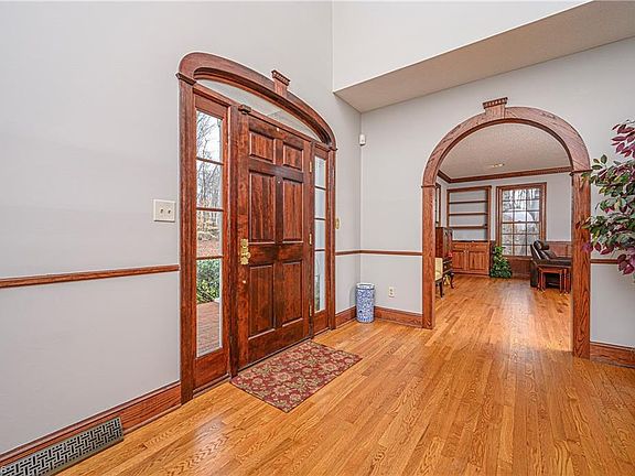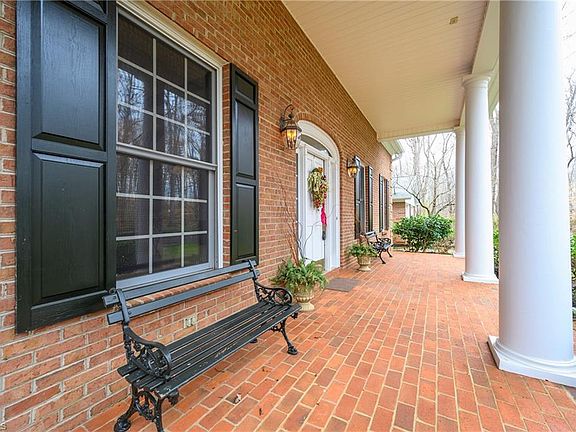 Plenty of privacy in this stunning home nestled on 7 acres w/beautiful veranda from the circle drive. Step into lovely home w/arched doorways, hardwoods throughout main level, living room w/cozy brick fireplace, vaulted ceiling in sunroom, & gourmet kitchen. Master & 2 BRs on upper level. 4th BR & large recreation room w/fireplace & wet bar on basement level w/full bath & unfinished storage area. Spacious deck w/hot tub & patio area overlooking meticulously manicured landscaping & yard. Storage building.
