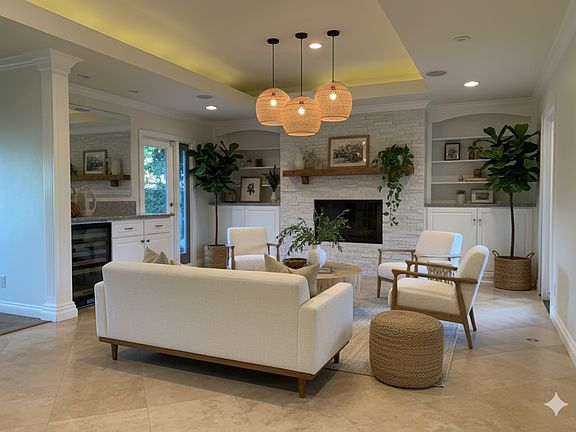 Step inside to a custom formal dining room, complete with a cozy fireplace, built-in cabinetry, and French doors leading to a tranquil patio and fountainan ideal setting for entertaining. The updated white kitchen, accented with granite countertops, seamlessly opens to an expansive family room boasting a second fireplace and additional built-ins.
