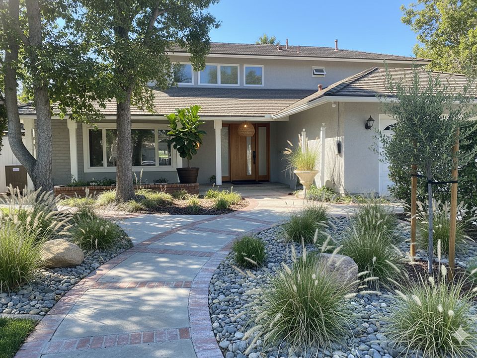 The backyard retreat is designed for both relaxation and gatherings, with two separate patio areas, a serene fountain, and ample space to enjoy outdoor living.
