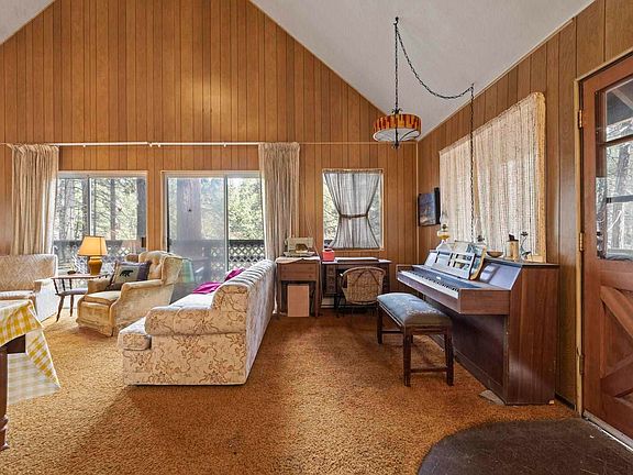 CHARMING CABIN in the Cedar Ridge Ranch subdivision. Step back in time as you enter this 1970's cabin with a rustic boho vibe. Quaint and cozy best describe the interior which offers vaulted ceilings and iconic wood paneling accents. An open dining and kitchen area offer adequate space to gather and all your essential appliances. Finishing off the main level is a full bathroom with a tub/shower and a main level bedroom. UPSTAIRS is an open loft bedroom which can easily accommodate 2 beds. The back deck provides a shaded spot to relax and the yard provides a natural environment to enjoy the pines. STORAGE can be found under the home in the basement which is accessible from both the interior and exterior. Residents of Cedar Ridge enjoy the ditch walking trail as it meanders throughout the area and connects to Twain Harte. Plenty of room to create a driveway in front of the home. While the current owners have kept this their family vacation home this is a very suitable home for those who want to enjoy a permanent residency.