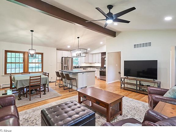 Wonderful 4 level split remodeled! Call to see this fabulous home on a culdesac with many updates. This home has vaulted /beam ceiling in the Great Room. New kitchen with white cabinets and oversized island. The island is 66 x60 with leather granite and great sitting area. The hardwood floors have been refinished in the Great room, Dining and Kitchen. There are newer stainless steel appliance and a commercial range hood. The Swing bath from Master completely remodeled with tub surround, cabinet and tiled floor. Second bath with newer cabinet, counter top and flooring. 3 Spacious bedrooms up with great closet space- all freshly painted and hardwood floors. The family room has a wood burning stove, plus slider leading to patio.The 4th bedroom/den is located off family room with access to second bath. Both rooms have been freshly painted and has new flooring. Roof was a tear off in 22 and windows have also been updated. This home sits on over a half acre with a private treed back yard.