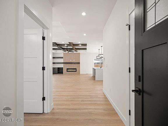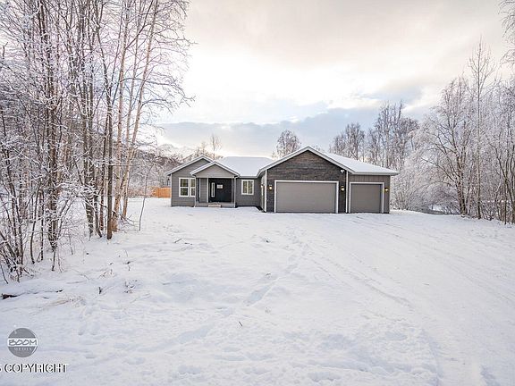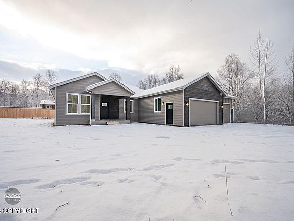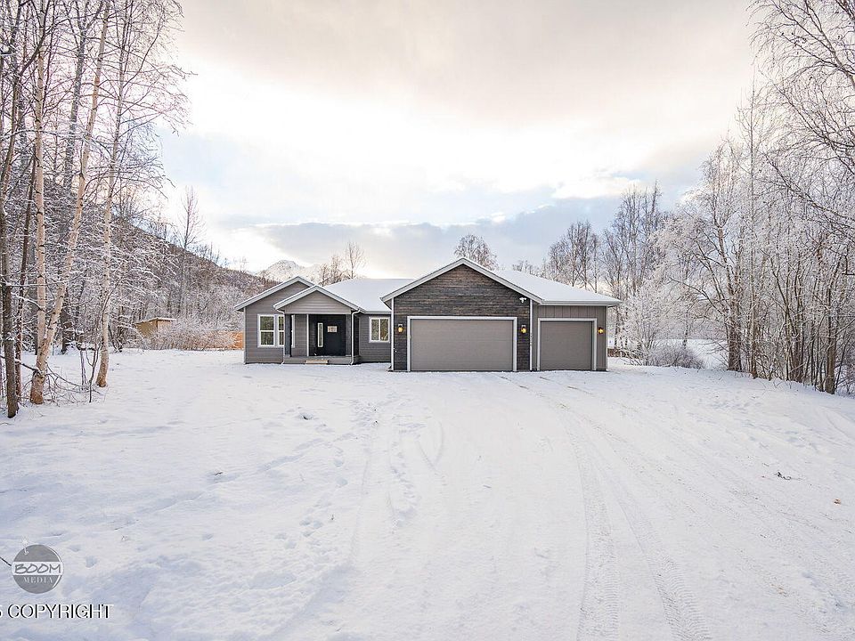 Welcome to another masterfully designed residence by Elegant Homes, where high-end craftsmanship meets everyday comfort. This beautifully built ranch-style home offers 1,772 sq ft of open-concept living with 3 bedrooms, a versatile office or 4th bedroom, and a massive 860 sq ft, 3-car garage--perfect for storing all your Alaskan toys. Inside, you'll be greeted by with an open concept livingspace with a fireplace and built in shelving! The ceiling has gorgeous recessed beams, while the kitchen boasts quartz countertops, a large center island, and soft close cabinets. Retreat to the private primary suite, complete with dual vanities, a tile-surround shower, and an expansive walk-in closet with custom built-ins. Secondary bedrooms are generously sized with ample closet space and share a well-appointed full bath. The office/flex room with closet offers the ideal space for working from home, guest stays, or a home gym. As a bonus the garage is already pre-wired for your electric car as well! Located in a peaceful setting with convenient access to local amenities, this home checks every box for stylish and functional Alaska living.