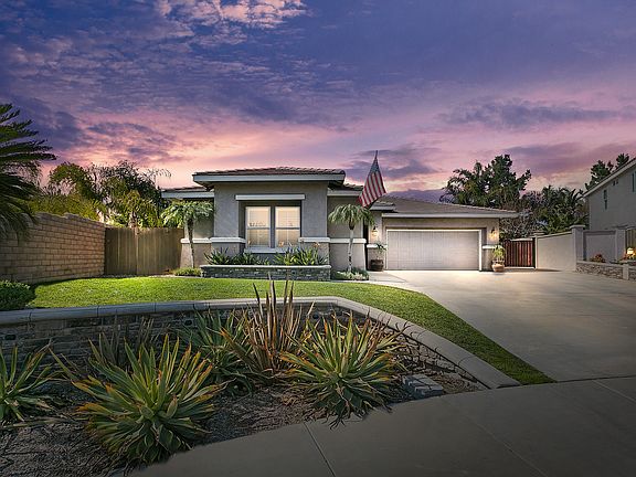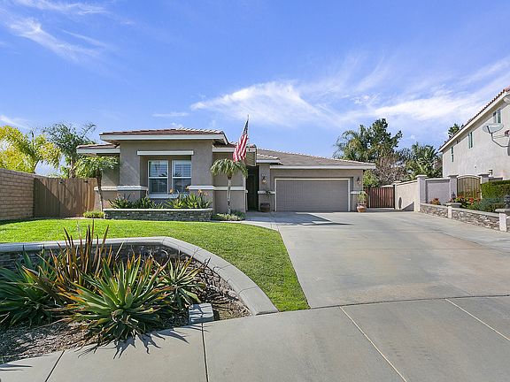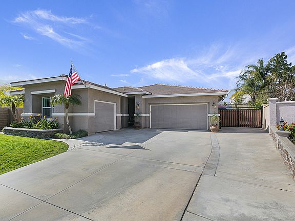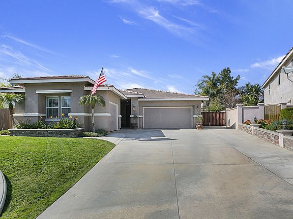 Absolutely Stunning single story, Entertainers dream home!!! Situated in a quiet Cul-de-Sac, 2483 Sq/Ft, 3 bedrooms, 2 1/2 baths, on a 11,761 Sq/Ft Lot. Wood floors throughout, formal living & dining rooms, wanes coating, plantation shutters, crown molding, 5" baseboards, chair rails, gourmet kitchen, stainless steel appliance, 9 foot island, granite counters, travertine backsplash, under cabinet accent lighting, pots & pans drawers, 5 burner cook top stove, farm sink, built-in wine glass holder, pantry and French doors. Volume ceilings, Fireplace and built-in entertainment cent is family room, ceiling fans in all rooms, herring bone marble master bath floor, his & hers walk-in closets and built-ins. Resort style backyard with salt water pool & spa, Caribbean blue pebble tech, slide, reef step,alluma-wood patio cover, ceiling fans, seating area with fire pit, custom stone island bar, palapa, BBQ, searing station, sink, refrigerator, accent lighting, tropical landscaping, wired for speakers, fruit trees, stamped concrete, shed, grass area for kids to play, gated RV parking for a boat, wave runners or motorcycles. Home also has solar, newer AC unit 2 years old, low, low taxes, Low HOA, 3 car garage and built in 2002. A fantastic Home, You will Love this Home!!!