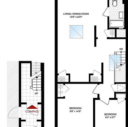 Upstairs, find a spacious large 2-bedroom, 1-bathroom apartment with two gorgeous skylights bringing in year-round sunlight. The living space is over 33’ deep, allowing more than enough space to be configured into a third bedroom, home office or den that still retains natural light. The double-countered large kitchen opens up to a view of the backyard, and the bath is completed with a soaking tub and chic tiled floors.