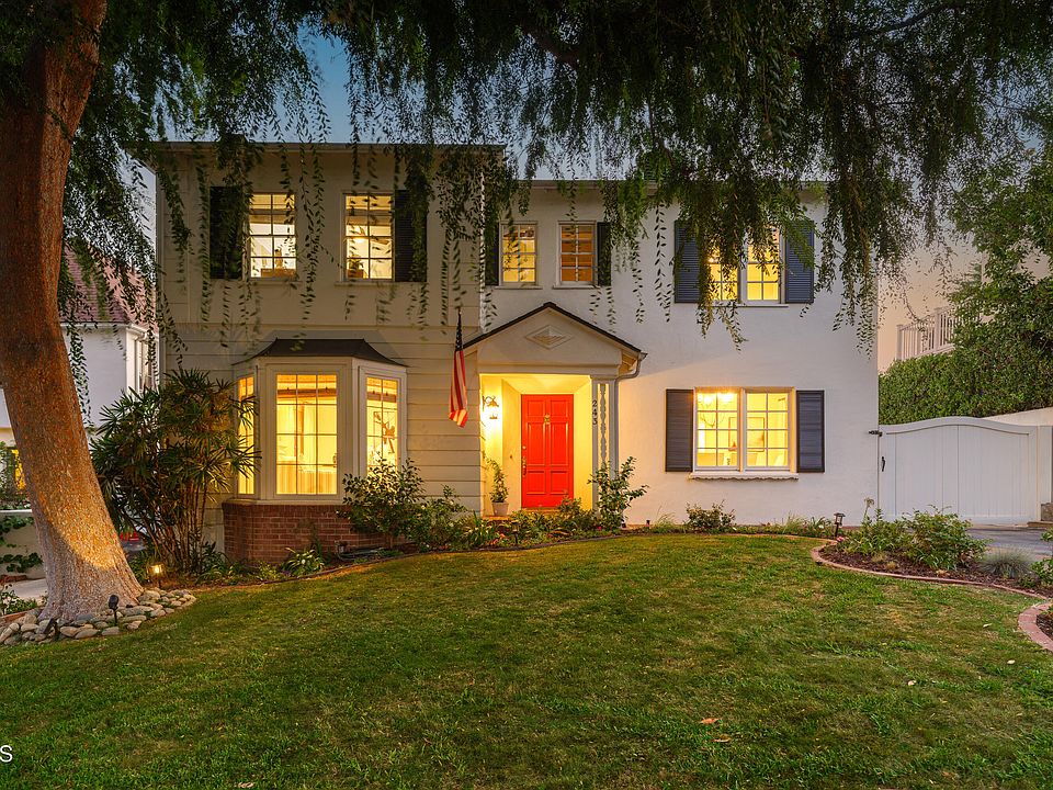 Situated in the sought-after San Rafael neighborhood is this beautiful two-story Colonial home that is on a tree-lined street & features 3 bedrooms, 2 bathrooms, spacious living spaces, a luxurious kitchen, & a beautiful backyard! Curb appeal exudes featuring the picturesque exterior of the home, the large bay window, the well-maintained lawn, the flowers, & the large tree that provides a pleasant shade to the home. Past the front door, one is struck by the home layout, which features the staircase, living room, dining room, hardwood floors, & crown & base molding throughout. The living room is light & bright & features a large bay window, wainscoting, recessed lighting, & a gorgeous fireplace that is perfect for entertaining! To the right of the entry, sits the spacious dining room which features wainscoting, a chandelier, & large windows which allow for natural light to enter. The dining room seamlessly opens to the breakfast nook which showcases a dry bar area with display shelves & a mini stainless steel refrigerator. The luxurious kitchen features a beautiful quartz countertop, subway tile backsplash, an abundance of cabinets, recessed lighting, & Jenn-Air stainless steel appliances that include the refrigerator, gas range, & dishwasher. The kitchen also has a door that leads to the beautiful patio deck. Towards the back of the home sits the spacious primary suite that features recessed lighting, a walk-in closet, a ceiling fan, & French Doors that lead to the backyard. The ensuite bathroom is luxurious & has basket weave tile floors, a stone countertop, two sinks, a large vanity, & a glass-enclosed shower that has subway tiling that extends to the ceiling. Upstairs sits the two additional bedrooms & bathroom. Both upstairs bedrooms feature wainscoting, a ceiling fan, & large windows with beautiful tree-top views. The hallway bathroom has tile floors, an oversized vanity with stone countertops, windows with custom shutters, & a tub/shower combo that has tiling on the wall that extends to the ceiling. There are many things to love about this home, especially the gorgeous private backyard that features two pergolas, two patio areas, & an abundance of greenery, flowers, & trees. This is the perfect place for al fresco dining & entertaining guests. This picturesque Colonial home is perfect for enjoying premium indoor & outdoor living & taking in the Southern California sunshine! Don't miss the opportunity to call this luxurious Pasadena home yours!