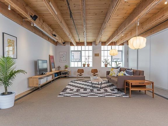 Dramatic and rare sun-drenched loft in vibrant Kendall Square, centered on a two-floor atrium topped with an enormous skylight. Ground level is an enormous, open, and flexible space--perfect for hosting intimate gatherings or memorable big parties--a full bathroom with glass shower and underfloor radiant heat, in-unit laundry, and a sleek kitchen with high-end Liebherr refrigerator and Frigidaire 5-burner gas range. Upstairs is a spacious master bedroom with rich pine floors, en-suite bathroom, and large closets; a home office; and a large second bedroom. Another oversized skylight floods the second bedroom and study with natural light. Outdoors is a welcoming and sizable shared patio with a vine-covered steel gantry, an echo of the building's original use. Part of a 10-unit association with very high owner-occupancy. One assigned off-street parking space, central a/c, and a walk score of 86 make this the perfect urban residential loft. Coolest place in town