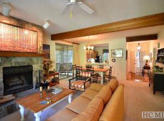 Easy, carefree living in this Highlands Falls lower level condo. All on one level and nicely furnished with view of golf course and stream. Lovely stone fireplace in living room, new carpet and some hardwoods. Good separation in bedrooms. To enjoy the Club amenities you must be approved to purchase a social or equity golf membership.