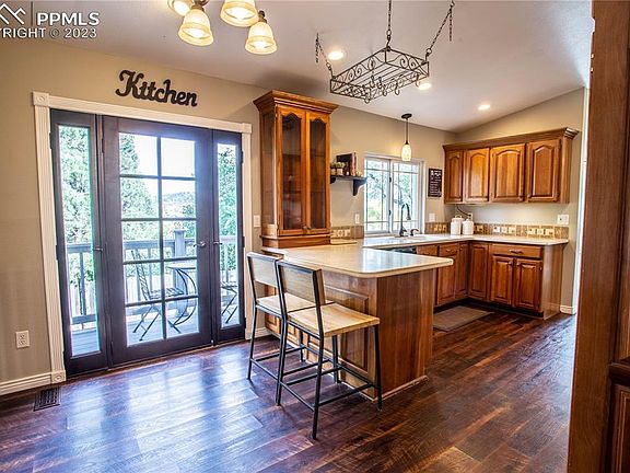 The quiet neighborhood welcomes you to this house that has been the owners' pride & joy. The front of the house is immaculate, with a beautiful lawn large enough for yard games galore. The front yard also features the first of TWO large natural gas fire pits on the property, to enjoy those chilly evenings with family and friends. Upon entering the home, you are greeted with vaulted ceilings & an open, welcoming layout. To your right, enter the spacious living room & enjoy views of Pikes Peak while you cozy up on the front window seat. The kitchen features custom cherry wood cabinetry, under-cabinet lighting, and plenty of space for cooking & entertaining. Off the kitchen, step out onto the balcony to sip your morning coffee. Heading upstairs, the large master bedroom is bright and open with vaulted ceilings and a master bathroom attached. There are two more bedrooms and one full bathroom upstairs. Both upstairs bathrooms are updated & complete with newer Velux skylights for plenty of natural lighting. Heading down to the lower level, the entertaining possibilities continue. Currently being used as a media/movie room, this room features a wood-burning fireplace & is also viewable from the kitchen upstairs, giving an open feel when entertaining guests on multiple levels. Walk out the French doors and escape to the private backyard complete with a large, lighted cedar gazebo, perfect for mounting a TV and watching your favorite sports games. A second gas fire pit next to the gazebo provides the warmth for the evening while you enjoy the views of Pulpit Rock! The backyard also includes a trampoline & natural gas connections for a BBQ/grill. Back in the house, a garden level basement features plenty of natural light, another family room, two nice-sized bedrooms, bathroom, & a laundry room. Other features: trailer/boat storage on side of the house, ceiling fans in all bedrooms. New in 2019: Roof, gutters, exterior paint, water heater, & central a/c.