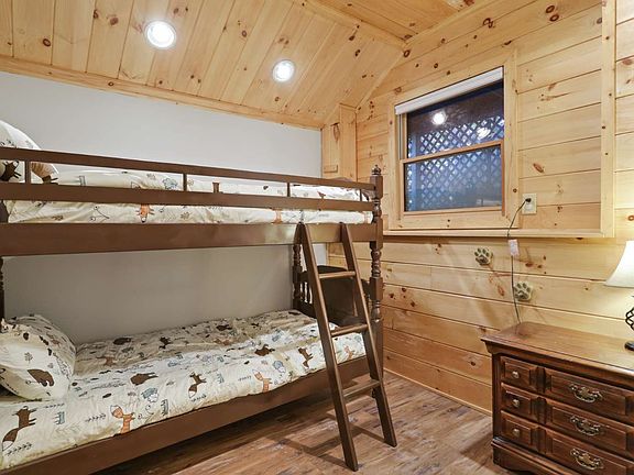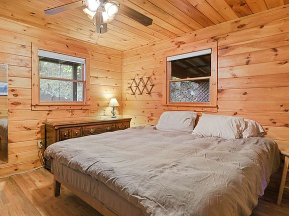 Oh myGwhat a jaw dropping Mountain VistaG.2-bedroom, 2-bath with pine floors and white pine interior with a cozy sleeping loft and a porch off sleeping loft to enjoy morning coffee, offering a perfect escape into nature. Nestled amidst the spectacular layered long range Mountain View's in this westward facing cabin, you'll be treated to glorious sunset views. The centerpiece of the living room is a beautiful stone wood burning fireplace, creating a warm and inviting atmosphere. The cabin comes fully furnished, ensuring you're ready to relax and enjoy your stay. For added entertainment, the terrace level features a recreation room that opens up to a deck with a soothing hot tub G perfect for unwinding while taking in the mountains and stargazing. You can also gather around the fire pit area on cool mountain evenings, creating memorable moments with friends and family. Located on 2 lots in Enchanting Forest which comprise 2.53 acres & situated on a quiet road that circles the mountain to provide a scenic door-to-door 1 mile walk - commonly with deer sightings. Secluded & private, this cabin is an ideal short-term rental property, just minutes away from the charming town of Blue Ridge, where you can explore restaurants and shopping. Additionally, you're conveniently close to Lake Blue Ridge and the Toccoa River, offering a wide range of outdoor activities. Whether you seek adventure or serenity, this cabin is an amazing place in North Georgia to own a vacation home.