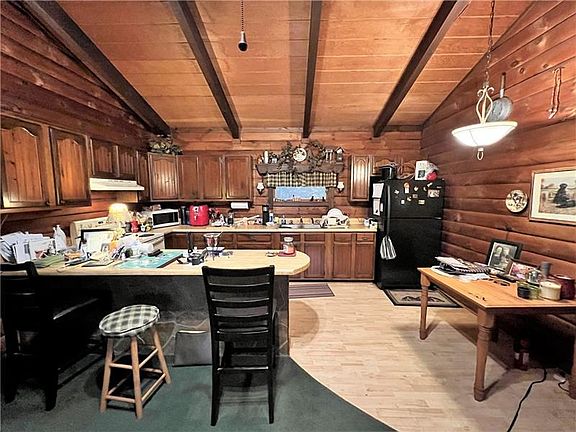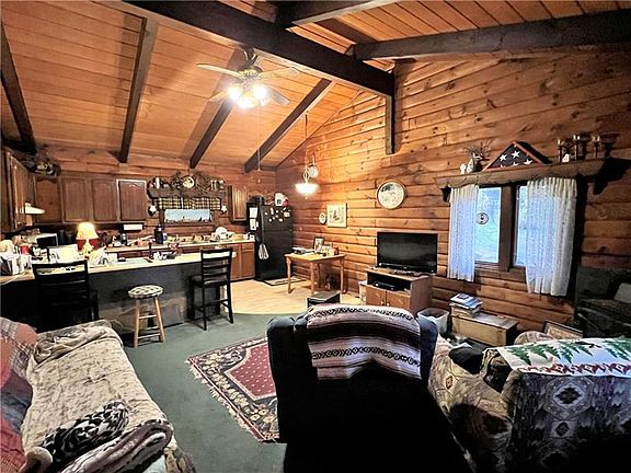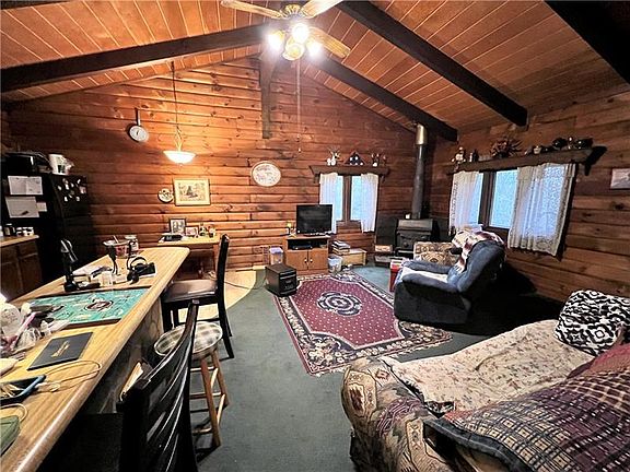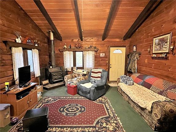 Serenity now! This log built raised Ranch home sits on a blissful 1.45 acres on a private road. The main level has vaulted ceilings, an open design for the living/dining/kitchen spaces, the master bedroom w/ large walk in closet, bedrooms 2, and a full bathroom. The lower level has a family room, a full bathroom, a workshop, laundry, and storage. Features include new oil forced air furnace & electric heat pump in 2021, metal roof in 2020, and a new refrigerator in 2021. Looking to add a garage or shed, the space is here! The only thing missing is YOU!