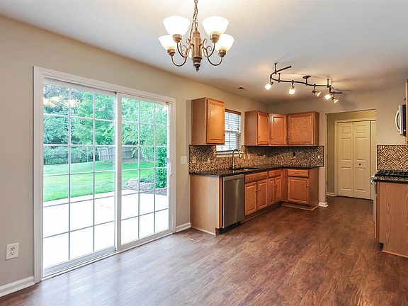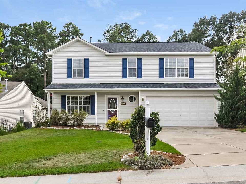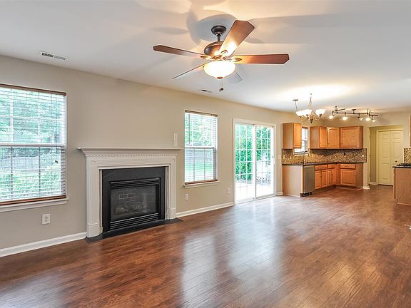 This Fuquay Varina two-story offers a fireplace, granite kitchen countertops, stainless steel appliances, a patio, and a two-car garage.