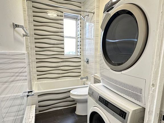 Modern white kitchenContemporary tiled bathroomEfficient heating systemGorgeous hardwood floorsSleek finishesStunning two-bedroom apartmentIn-unit laundry setup
