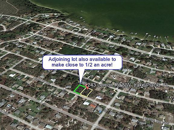Call or text the property owner, Kevin Corcoran. Contact information and website link can be found at the bottom of this page called: "See listing website". Lake Placid, FL - 10k SF Building Lot at 243 Lemon Rd with Water & Power in Clean, Well-Developed Neighborhood, 2 hr Drive to Orlando, Lakes & Recreation All Around! Beautiful, large 10,000 sqft building lot not in a flood zone, in a clean, well-developed neighborhood with nice homes all around near Lake June, shopping, a golf course and just over an hour?s drive to Orlando with water and electric service to the property line! This property is not in a flood plain, does not have an HOA fee and can be developed by hooking into water and power and installing a septic system. There is an optional $25 annual HOA fee that grants access to Tobler Park and the boat ramp to Lake June nearby. Site-built and modular homes built to local building code are allowed while manufactured homes are not allowed in Lake Placid, keeping these neighborhoods clean and at higher values than other communities that allow mobile homes. There are lakes all around for boating, fishing, hiking, bird watching and other recreational activities. Comparable lots on Zillow are going for $14,000 and higher and many of those lots for sale are much smaller than this property. Get this property today and hold for investment or build your dream home!