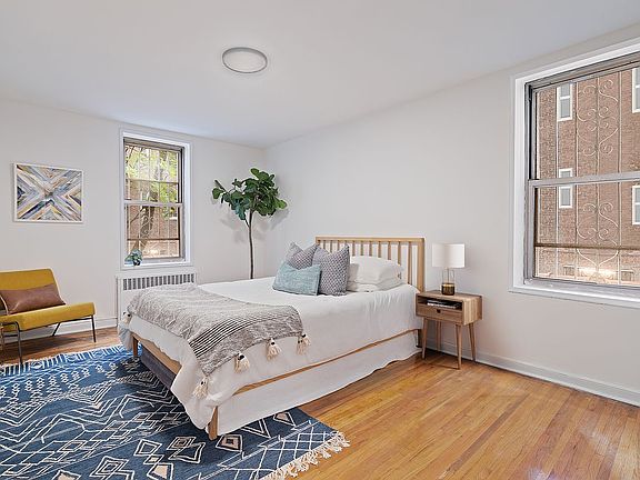 The well appointed first-floor home features hardwood floors and windows running throughout. Upon entering the foyer with two large closets, you are greeted by a recently updated windowed, eat-in kitchen to your right with ample counter and cabinet space and a separate dining area straight ahead which is adjacent to the oversized living room which provides generous room for living and entertaining. Dual exposures in the corner primary bedroom provide plenty of natural light, and the spacious second bedroom is light filled as well. Storage is not an issue here at all as there are closets throughout.