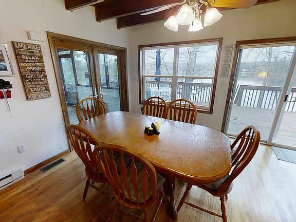 SPECTACULAR LAKEFRONT VIEWSContemporary on a landscaped Lakefront parcel with prime lake frontage and Southern exposure, features beamed great room with vaulted ceilings, stone fireplace and lots of glass with spectacular lake views, custom kitchen with eating bar and appliances, bright dining room with views and doors to large screened porch and deck, 1st floor master plus 3 additional bedrooms, 2 baths, laundry, large family room loft with super views, on a 100 acre lake, large Lakeside deck and private dock.