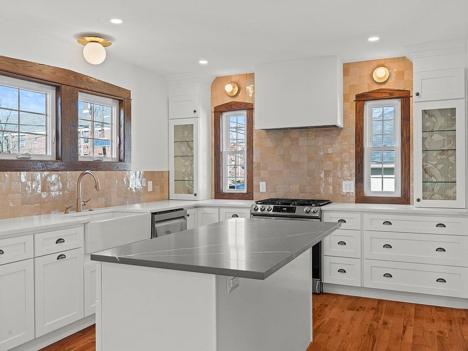 Brand new white shaker, soft-close, dovetail joint cabinets, sleek marble inspired quartz, moroccan zelliage tile, freestanding island with seating for three. All new stainless steel appliances with backless gas cooking range and custom built in exhaust hood.