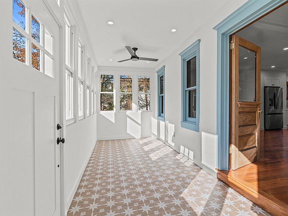 Enter into a sundrenched enclosed front porch with beautiful ceramic tile, and originally restored front door, equipped with a ceiling fan for hot Summer days.