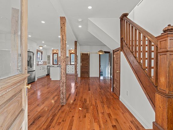 Main living area is open and inviting with brand new hardwood flooring throughout, antique brass fixtures and exposed wood beams. All historic original woodwork has been newly restored.