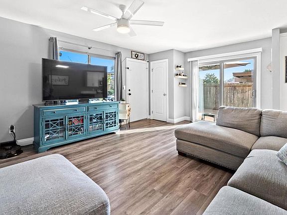 This beautifully updated end unit townhouse is in the highly desirable Rancho Rios Community. The lovely two-story home has a spacious upgraded kitchen with stainless steel appliances, new cabinets, and elegant white quartz countertops. This 3 bedrooms and 1.5 bathrooms open floor plan boasts a large family room that opens up to the private patio, making it perfect for all gatherings! There's ample natural light coming in through the custom dual-pane windows and patio door. All bedrooms are equipped with ceiling fans and LED lighting. Conveniently, this private corner unit has 2 assigned parking spaces and a generous amount of street parking. Laundry closet out on the patio. This pet-friendly complex has low HOA fees and features nearby trails, pool, playground, and more! This is the only modern unit available in the complex, so act quickly! Close to schools, shopping, coffee shop, and freeway access. Downtown San Diego and famous beaches are just a short distance away! FHA and VA offers are welcome.