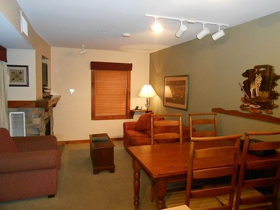 VERY well kept one bedroom, one bath at RimFire Lodge. This condominium is fully furnished, has a full kitchen, sleeps 4, has a stone fireplace, and a nice balcony with an absolutely fabulous western sunset and mountain view. RimFire is right in the village and features heated underground parking, hot tubs, fitness room, sauna, ski lockers, and more.