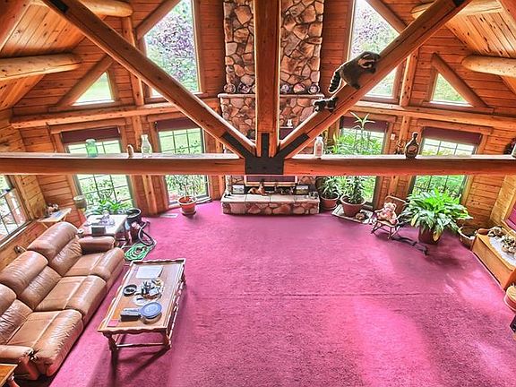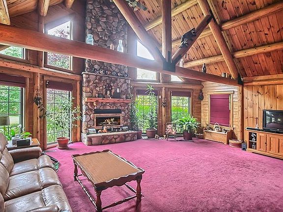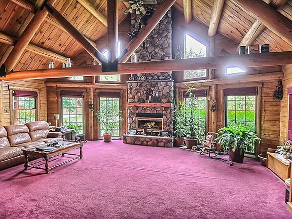 Spectacular 2 Story Log Cabin, with 16.5 Private acres. Full Log Home, with 1st floor master bedroom, with Jacuzzi Tub/ Master Spa. 2 car attached garage and 3 stall detached garage. Custom Kitchen Cabinetry, with ceramic tile flooring, opening into massive dining room. Sit on your back deck to watch the trophy whitetail deer, in the wooded forestry. The covered front porch overlooks the prestine front yard & gardens. Cathedral ceilings in the great room, with floor to ceiling windows.