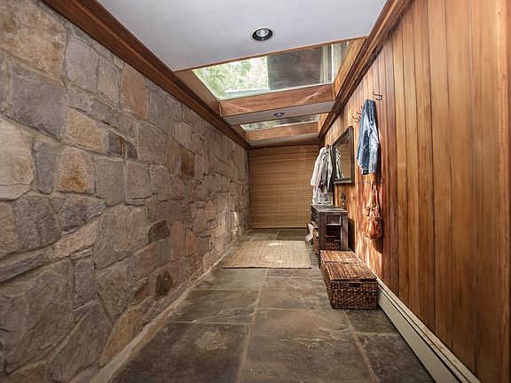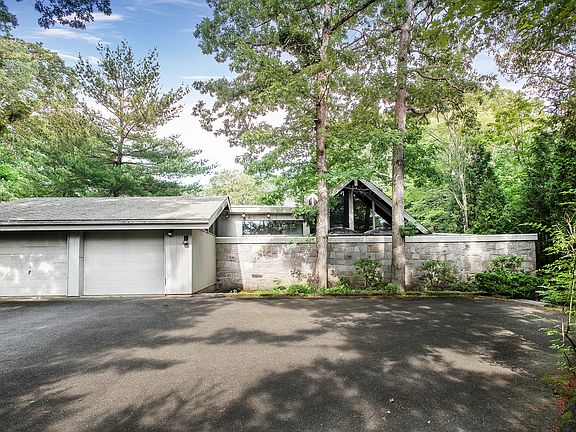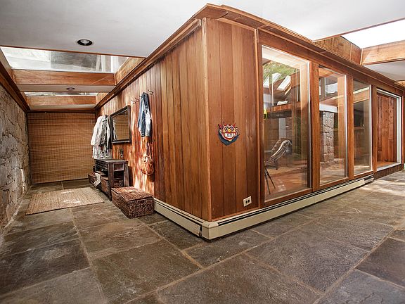 This hidden and truly captivating Mid-Century Modern features soaring ceilings, skylights, rich wood textures and stunning stone work. Five bedrooms, 5 1/2 baths and over 6800 square feet. The main core of the house is a Techbuilt house and was sited to take advantage of the stunning landscape. Exquisite stone additions enhance the drama of the house. Floor to ceiling windows bring in natural light and allows one to enjoy the many wonderful visuals of this property.