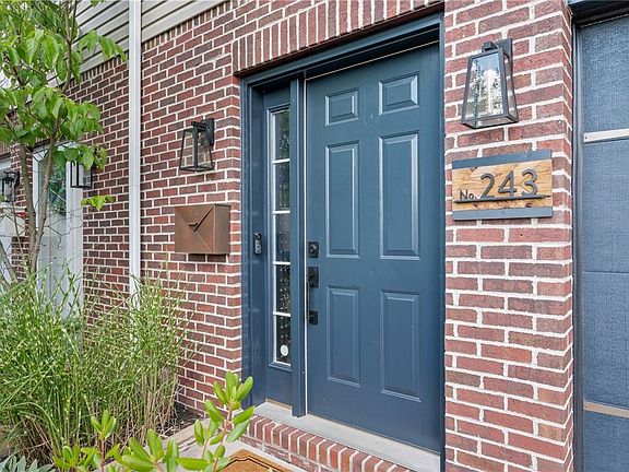 243 Southern Avenue offers a transitional modern design with thoughtful details throughout. The exterior features a cedar-wrapped bay window and a deep blue shaker garage door, hinting at the stylish interior. A wood shiplap accent wall and updated lighting create a warm welcome inside. The main floor boasts hardwood floors, a rustic wood beam, and an open kitchen with soft-close cabinets, a marble backsplash, matte black hardware, quartz counters, a large island, bar top, an eat-in area ideal for entertaining a walk-in pantry, and sleek powder room. A private fenced outdoor space with a deck extends from the kitchen. The living room features a brick accent wall, two-toned fireplace, and reclaimed wood mantle. Upstairs, there are 3 bedrooms and 2 bathrooms, including a primary suite with a walk-in closet, brass chandelier, and modern ensuite. The lower level offers a flexible space for a gym or office, complete with a wet bar. Located in a prime area near the “T” and bus line. No HOA.