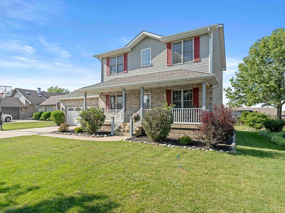 You'll love this move-in ready, 3-bedroom, 3.5-bathroom home located in Northwest Indiana's desirable Dyer community! Framed by mature trees, this freshly painted 2-story with finished basement is nestled into a rare HOA-free neighborhood. Enjoy some driveway basketball before sipping lemonade from a rocker on the cute covered front porch. Head inside where hardwood floors, vaulted ceiling, & spacious living room (with cozy fireplace) greet you. Move right into the eat-in kitchen, flooded with natural light. Then wander past the kitchen island to admire granite countertops, new backsplash, new hardware, new cabinet underlighting, & stainless-steel appliances. Enjoy easy access into the kitchen from the oversized 2-car garage - perfect for unloading groceries straight from your vehicle! Exit out the back patio door onto a trex deck with plenty of outdoor entertainment space, including a large above ground pool with new pump, professional landscaping, storge shed, & sprinkler system for the huge backyard. Return inside, where the formal dining room doubles as an office. Appreciate the new light fixtures throughout the main floor. Upstairs, you'll find a massive primary ensuite with walk-in closet, tiled shower, double vanity, & whirlpool tub. Explore 2 more bedrooms, full bath, & upstairs laundry! The finished basement offers a massive secondary living space, potential work out area, bathroom with shower, & plenty of storage. Experience peace of mind provided by a new security system. This home is a serene retreat situated just minutes away from schools, shopping, hospitals, & dining. Commuters will also appreciate easy access to major highways, making travel to Chicago & surrounding areas a breeze.