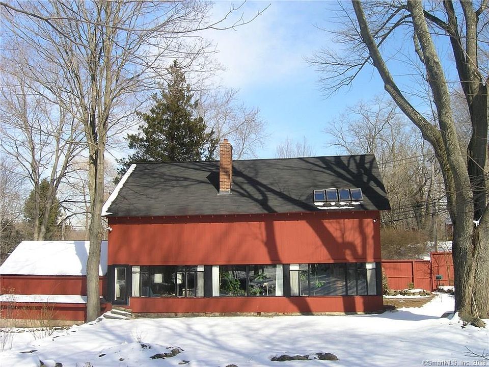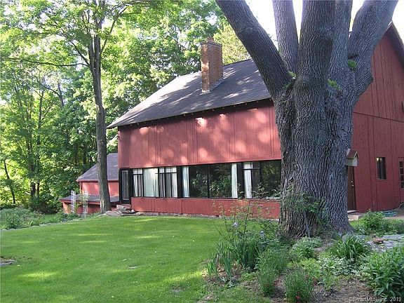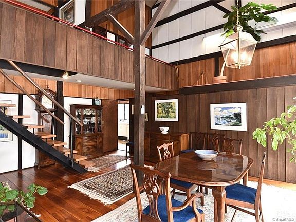 In 1955, 2 students from the Yale School of Architecture purchased a 90-year-old hay-filled barn and converted it "into a striking modern dwelling." Less than 10 years after it's completion, the current owners made it their home. It is now offered for sale for the first time in 54 years. A New Haven Register article dated May 1, 1955, gave a detailed description of the barn and the architects who transformed it; and the "striking" elements remain today. The interior is quite spacious, measuring 44 ft. long by 34 ft. wide by 27 ft. from floor to ridge pole. The layout includes a kitchen (facing east) with breakfast nook to one side and laundry/utility room to the other; a library, full bath, and a great room divided by a brick floor to ceiling fireplace. The current owners added a wood burning stove on the "dining room" side of the fireplace. Light floods the space with views of a private sanctuary yard, with perennial gardens and stone wall, overlooking the Twin Lakes Golf Course. A flight of stairs of solid oak planks leads to the second floor, containing two bedrooms (both of which have interior balconies) and another full bath. Beams made of white cedar surround the rough plastered ceiling. Using only woods native to New England, the architects chose wild cherry whitewood for the paneling; walnut for the doors; and rich red cherry for the wide plank floors. The home has city water and city sewer. This magical property is not to be missed!