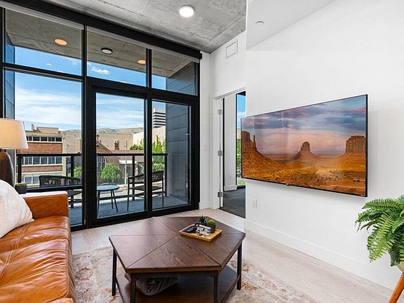 Welcome to your exclusive experience in downtown Salt Lake City. This modern and highly designed apartment is located just one block from the Salt Palace Convention Center and across the street from the Delta Center, placing you right in the heart of the action with restaurants and bars nearby, yet offering a peaceful and relaxing haven. The apartment features a light-filled living room with a luxury leather couch, a tastefully designed bedroom with floor-to-ceiling windows, and a beautiful bathroom with luxury toiletries. Enjoy the balcony with outdoor seating and views of downtown, and benefit from a full HE washer and dryer with laundry pods. The amenities here are absolutely amazing, including a rooftop pool and hot tub with 360-degree views of downtown and the mountains, a 24/7 gym, pool and poker tables, and common rooms with a conference room. The apartment features a fully stocked kitchen with stainless steel appliances, a breakfast bar, and a coffee station with organic coffee and tea. A high chair is available on request, and the living room is equipped with a 65" flat-screen Roku TV and hi-speed Wi-Fi. Enjoy a free parking pass to a nearby outdoor parking lot with one parking spot, and additional paid parking options are available under the building with paid EV charging. Ski storage is available for a small fee. Early check-in is guaranteed by 1 pm and late check-out is at 12:30 pm for a $30 fee. Housekeeping is available during your stay with options for daily, weekly, bi-monthly, and monthly cleanings depending on your needs. Concierge services are also available for errands like shopping, sending packages, and dry-cleaning drop-off. Situated in the downtown SLC neighborhood, this apartment is directly across the street from the Delta Center and just 11 minutes from Salt Lake City International Airport. It's one block from the Salt Palace Convention Center and less than 40 minutes to all the ski resorts in SLC and Park City. You're also less than 5 minutes from Temple Square and City Creek Mall. Quiet hours are from 10 pm to 8 am. The apartment has a no-smoking or vaping policy with a minimum fine of $500 per occurrence, and no pets are allowed unless explicitly agreed upon, with a minimum $200 fine. Check-in time is 4 pm and check-out time is 10 am, with a $50 charge for late check-out in hourly increments. Lost key fob incurs a $150 fee, and a lost parking pass is $250. Damage due to bodily waste has a $100 minimum additional cleaning charge. Entertaining is allowed for up to 2 guests, but no parties are permitted, with a minimum fine of $1000 for unapproved parties. All overnight guests must be included in the booking, with a $100 fine per unregistered guest. Resident amenities may be unavailable due to maintenance or other reasons, and guests are not entitled to refunds based on availability. The apartment management may enter the property for urgent maintenance or legal compliance, but permission will be sought from guests beforehand. Do not contact the apartment complex management directly; contact us anytime for assistance. The apartment includes an office desk and chair, providing a laptop-friendly workspace with hi-speed Wi-Fi, making it ideal for remote work.