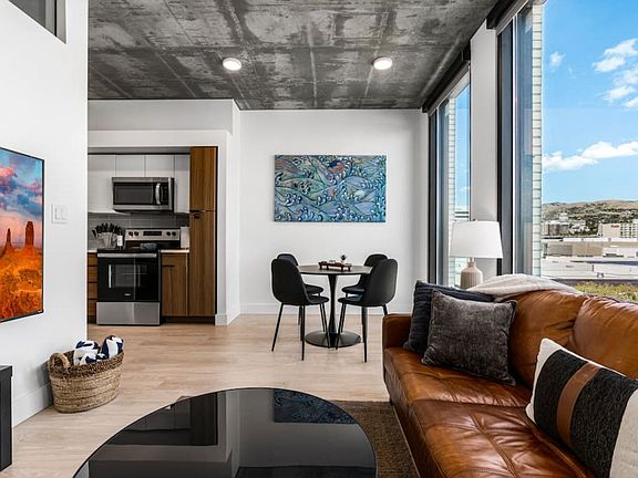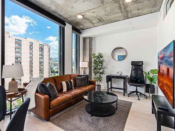 Welcome to your exclusive experience in downtown SLC. This modern and highly designed apartment is located just 1 block from the Salt Palace Convention Center and directly across the street from the Delta Center. Situated in the heart of the action, with restaurants and bars nearby, it offers a peaceful and relaxing haven. Enjoy one of the most stunning views from the 9th floor, with floor-to-ceiling windows offering downtown and mountain vistas. Experience the difference with custom designs, high-end furnishings, original local art, and a fully stocked kitchen. The apartment features a luxury leather couch, a 65" flat-screen Roku TV in the living room, and a dining table with seating for four. The tastefully designed bedroom includes a king-size bed with a luxury mattress, and the beautiful bathroom comes with luxury toiletries. A full HE washer and dryer with laundry pods are also available. Enjoy a free parking pass to a nearby outdoor parking lot for one spot, with additional paid parking options under the building and paid EV charging available. Ski storage is available for a small fee. Early check-in is guaranteed by 1pm and late check-out is at 12:30pm for a $30 fee. Housekeeping services are available during your stay with various options depending on your needs. Concierge services for shopping, errands, and dry-cleaning drop-off are also available. Located in the SLC neighborhood of Downtown, this apartment is across the street from the Delta Center and just 11 minutes from SLC International Airport. It's 1 block from the Salt Palace Convention Center and less than 40 minutes to all the ski resorts in SLC and Park City. Temple Square and City Creek Mall are less than 5 minutes away. Quiet hours are from 10pm to 8am. Guests must be 25 years or older to book the apartment, and children are welcome under adult supervision. No smoking or vaping is allowed in the apartment or on complex property, with a minimum fine of $500 per occurrence. No pets are allowed unless explicitly agreed upon, with a minimum $200 fine. Check-in time is 4pm and check-out time is 10am, with a $50 charge for late check-out in hourly increments. Lost key fob incurs a $150 fee and lost parking pass is $250. Damage due to bodily waste has a $100 minimum additional cleaning charge. No parties are allowed, with a minimum fine of $1000 for unapproved parties. All overnight guests must be included in the booking, with a $100 fine per unregistered guest. Resident amenities may be unavailable due to maintenance or other reasons, and guests are not entitled to refunds based on availability. Do not contact the apartment complex management directly for any reason. The apartment includes an office desk and chair, providing a laptop-friendly workspace with hi-speed Wi-Fi.