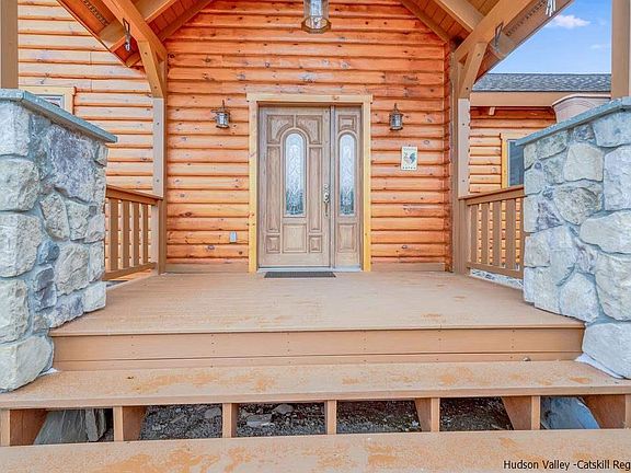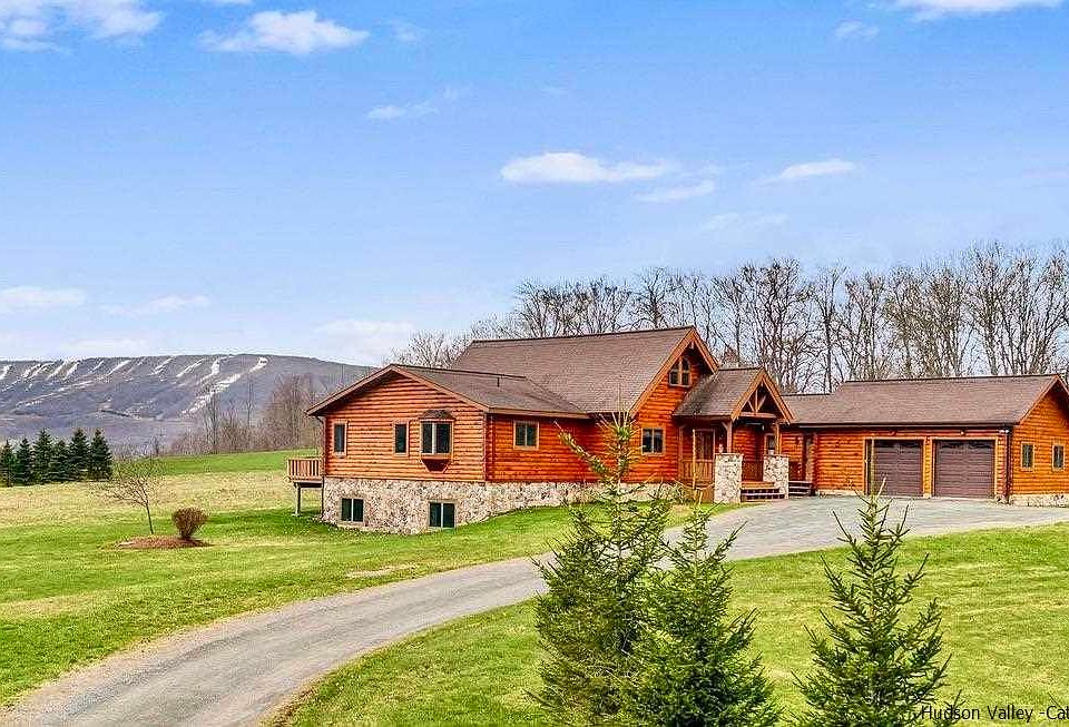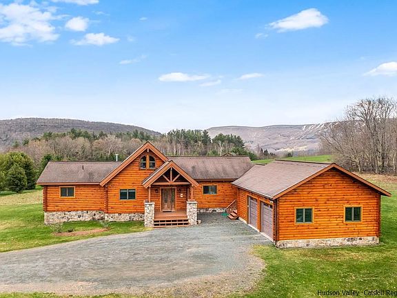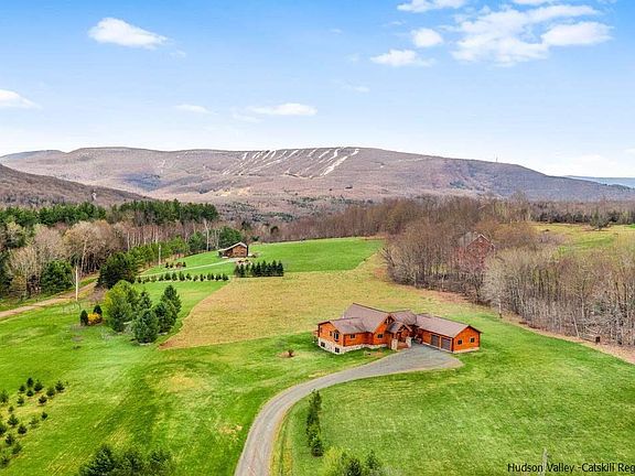 To ski or not to ski: that is the question. Yes or no, enjoy a quintessential Catskill Mountain view that includes the slopes of Belleayre Mountain Ski Center--or the view from the slopes back to your beautiful home! Custom designed and built by builders of log homes as their home since 2004, yet so meticulously and immaculately maintained inside and out you will swear it's brand new! Most of the 5 acres are groomed lawns and fields--as are the neighboring properties on coveted Brush Ridge Rd. Enter through a front foyer to the welcoming The A-frame living room with 2 stories of windows, a soaring stone fireplace and a loft space above, perfect as an office and/or bonus sleeping area. This kitchen has it all. Stainless steel appliances, spacious Travertine island for food prep and entertaining, separate breakfast bar, formal dining room area and French doors to an expansive outdoor deck. Off the kitchen is one of two guest bedrooms as well as internal entry to the oversized 2 car attached garage. Situated off the far side of the living room are the 2nd guest bedroom and the en suite master bedroom with 2 person Jacuzzi tub. This floor plan is ideal for maximum privacy under one roof. Down a flight of stairs find a finished basement area with workout and family room you could easily transform into another bedroom suite or apartment. With the exception of one guest bedroom, every room in the house features windows with south-facing views of the aforementioned view across the valley to the ski mountain and beyond. All this and you are just 2 hours from the GWB, 5 minutes to Belleayre and accessible to all the natural beauty, recreation, arts, culture and cuisine that make the Hudson Valley/Catskill Mountain region so highly desirable. It's why we live here. Now you can, too!