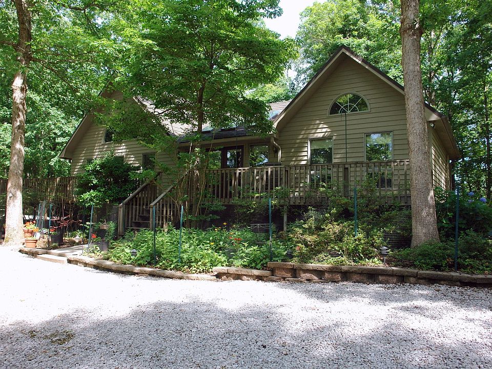 A MUST SEE! There is no other home like it in the Cove. A private and wooded community not too far from town. Peace and Tranquility is what you'll get from this 3 bedroom, 3 bath home nestled on a private cul-de-sac surrounded by beautiful trees & wildlife. Large windows are surrounded by the wood & stone siding. Walk into the front door to a bright and open floor plan. The home was repainted and the decks were refinished in 2016 along with new limestone floors in the kitchen, sunroom & laundry room. The kitchen has beautiful oak cabinets and tons of storage. Home has central vacuum system complete with attachments. Additional living quarters in the basement was completed in 2000 with a walk out door to a covered porch and sitting area. A new roof with metal shingles was replaced in 2014 and 6" gutters were installed. The wood stove can heat the entire home and has been maintained each year. A tankless water heater was installed when they switched to city water and natural gas in 2010. The two-car detached garage was built in 2004 along with an upstairs apartment complete with kitchen, closet, linen closet and full bathroom. You'll feel secure with the updated security system replaced in 2015 along with a driveway alarm and you'll stay cool or warm with the new HVAC 4 ton unit replaced in 2005. No worries if the power goes out since there is a portable generator by an outside standby box. No wood destroying bugs will get this home. Owners have a termite contract in place and have it inspected and sprayed each year. A storage shed (10' x 16' x 7') for your garden tools was installed in 1999 and a large barn with over sized doors for a travel trailer with a storage loft on one side was built in 2015. This home has it all and has been well-maintained and updated over the years. It has been used as a vacation home with them staying only six weeks at the house for the first 10 years and then since 2000 they stayed for five months at a time. Come see for yourself.