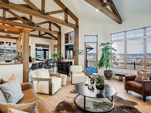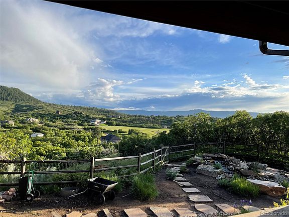 Absolutely stunning custom home with sweeping panoramic views of the front range plus a gorgeous babbling brook water feature all on a private 5.5 acre lot in the prestigious Keene Ranch neighborhood. This Ranch style home has an open floor plan with vaulted ceilings, wood beams, natural hickory wood flooring and a fully finished walkout basement with amazing views from every window! The Gourmet Kitchen has leather granite countertops with and island, GE Monogram appliances including a 6 burner plus BBQ gas range with double ovens warming drawer, Thermador hood with 2 heaters, large refrigerator, microwave, trash compactor, Bosch D.W. Kitchen opens to dining area and wet bar with wine refrigerator. The Great Room has gas fireplace, built-in cabinets & hidden T.V. The spacious Primary Suite has a gas fireplace, attached 5 piece bath with Oversized DbL Head Stem Shower and Jetted Tub. The attached large walk-in closet has built-ins and access to the main level laundry. There is an attached private deck with hot tub hookups. There is an additional main level bedroom with 3/4 bath. The back deck has a screened in porch with motorized shades plus an adjacent area with gas firepit and grill all to enjoy your beautiful Mountain and City Views! The finished walkout basement also has great mtn. views and family room with gas fireplace, wet bar 3 bedrooms, office and Sauna with separate stair case for Primary bdrm. access. There is a large mech/storage area. The property has beautiful landscaping, fenced yard, paved driveway with Security Gate, 3car garage/workshop, generator, security system, sound and lighting system, central vacuum, nest thermostats, remote control blinds, electric dog fence, walking & horse trails. Close to Dawson Butte Open Space, Bear Dance Golf Club, Castle Rock with great shops, entertainment and dining. Amazing views, beautiful home and landscaping, privacy and an abundance of wildlife, come enjoy!