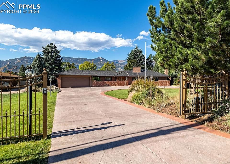 Truly one you HAVE to see in person. This gated home includes two primary suites on the main level, incredible vaulted ceilings with beams throughout, 5 fireplaces, and the most peaceful backyard with Pikes Peak mountain views (once the leaves have fallen). The first primary suite includes an incredible sun room, fireplace, wet bar, two showers, two walk-in closets, a large dressing room that has been used as a nursery, and a grand soaking tub. Off the main primary suite there is an oversized sunroom and covered patio leading to the oasis of a backyard including a fish pond. The newly added primary suite has its own exterior entry, fireplace, small kitchenette (with a small stove), and its own 3/4 bath. The great room is perfect for entertaining with a large secondary living room attached, each with their own fireplace. There are two separate basements. The first a small room perfect for a playroom or theater, the other basement includes an oversized entertainment space with gorgeous built-ins, an exercise room, bedroom and full bathroom. This house is so unique and truly such a special find. In an ideal location, without the restriction of an HOA.