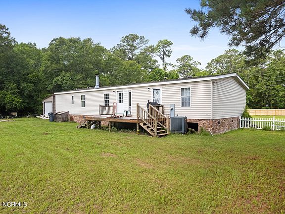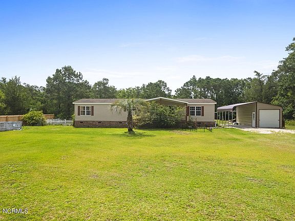 Located only 5 minutes from Holden Beach, this home includes a spacious 1 acre lot that is inviting and beautiful! This home features an open floor plan with 3 bedrooms, 2 full bathrooms, a detached storage building with a drive in carport, a beautiful front porch with two sets of stairs, and a great fence wrapping around the front yard. In the home are nice hardwood floors in the living room with a stunning fireplace. The primary bedroom features a large walk in closet as well as a nice sit-in bathtub in the primary bath. You don't want to miss out on this one!