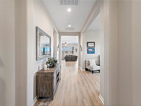SUNSET VIEWS! SUNSET VIEWS! SUNSET VIEWS! Beautiful nearly-new single story in the 55+ Terramor community by Del Webb. A long list of amenities to keep you active and engaged include two community clubhouses, gym, outdoor pool and spa, indoor saltwater pool, bocce ball, pickleball, and a wide variety of social activities. This home, boasts upgrades GALORE from the builder AND has seen further improvements since. UPGRADED LVP flooring throughout home, UPGRADED interior paint, soft water system, extra electrical outlets in garage, storage racks in garage, ceiling fans in all living spaces, beautiful fireplace in the family room, double-door pantry, laundry room sink and extra storage cabinets, 220/50A circuit for HOT TUB, DOUBLE enclosed patio (includes lighting and prewired for patio ceiling fans), gorgeous FINISHED landscaping including a sprinkler drip system. The large, open entry includes a nearby bonus room that can be a third bedroom if desired. Upgraded cabinetry throughout. 10 foot ceilings throughout. The great room is open to the eat-in kitchen where you can enjoy breathtaking PANORAMIC VIEWS of the rolling hills and sunset. The master suite shows a walk-in shower and a spacious walk-in closet with an upgraded built in storage and hanging system. The hallway bathroom is upgraded similarly with high end materials. Attached two car garage with additional hanging storage. Window blinds and 12 Tesla solar panels (maximum for the home!), which overproduce for the current owner, will keep your electric costs low this summer! Less than 20 minutes to downtown Corona, or head south toward Murrieta for shopping, dining, and more!