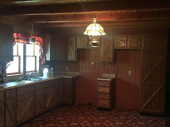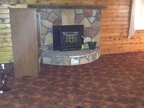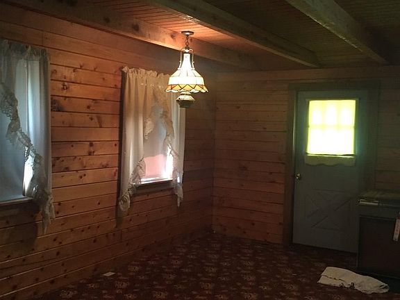 Kitchen has newer cabinets,2 BR, master BR closet 14.x2.8, full bath, living room has earth stove-burns wood, full basement electric furnace, well pump in basement, large front porch, exterior and interior both log.