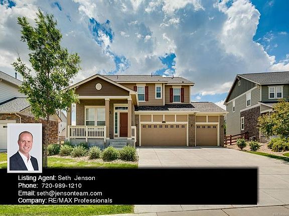 This former model home has style, comfort and great flow! The shady front porch offers a friendly welcome. Casual beauty begins with the first step inside, where wood floor entry opens to study/den with picture windows. Go formal in the dining room, or chill in 2-story family room with fireplace. Family room opens to sunny kitchen with plenty of room to make cookies, do homework, or eat dinner. Magazine-worthy features include gorgeous granite slab on countertops & island, stainless appliances and handsome cherry cabinets. Master suite sports vaulted ceiling and spacious walk-in closet lined with shelving and smart double racks. Master bath has oversized shower with tile surround. Secondary bedroom with ensuite bathroom is a teenagers dream! New concrete tile roof in Feb 2015 has transferable warranty. 3-car oversized garage fits pickup. Window coverings included. Professionally landscaped. Walk to schools, playground and community pool! Available for quick possession, so dont wait! Listing Agent: Seth Jenson Company: RE/MAX Professionals Phone: 720-989-1210 Email: seth@jensonteam.com
