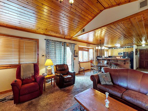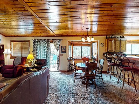 Wonderful single level home with spectaculars views! This is what you come to the mountains for.....just a couple of steps up to the front door and you enter an open floor plan house with the beautiful mountain views through almost every window. Charming rock fireplace in the corner of the living room with an efficient wood stove insert as well as a FAU AND a mini split that both heats AND cools. Lovely tongue and groove knotty pine ceilings. Open U shaped kitchen with lots of cabinetry, gas stove, granite counter tops, view window over sink, dishwasher, trash compactor, microwave and refrigerator. Conveniently located hall closet for laundry, spacious hall bath with shower, guest bedroom and master suite at the end of the home with multiple closets, separate sink area and full bath. All on one level with amazing views and a deck that runs the full length of the house.... BUT wait there is a bonus....a lower level workshop and storage area the full length of the house with another full