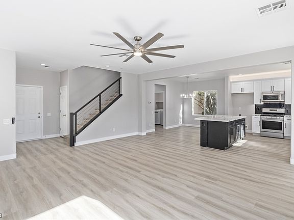 Enter your front door into fully remodeled wide open concept living! Neutral waterproof plank floors are accented by entertainment center inlet boasting black shiplap accents. White quartz tops in kitchen have black/grey veins, accented by brand new white cabinetry with black pulls and custom black marble honeycomb style backsplash. Island offers accented black cabinets. All 3 bedrooms are located on the 2nd floor that also features small loft/office space. Primary suite has attached bath with custom tile shower, beautiful free standing tub and quartz tops. Backyard is fully landscaped and is low maintenance! If you need a pool, the backyard is perfect to add a future pool! EVERYTHING INSIDE REMODELED! Schedule your tour today!
